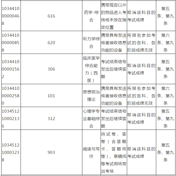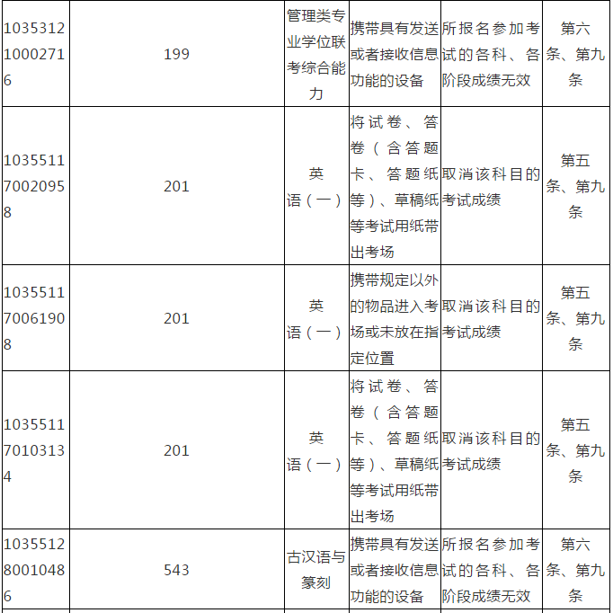 公告称,根据《国家教育考试违规处理办法》(教育部令第33号)第二十五条规定,现将在我省2021年全国硕士研究生招生考试中,被认定为考试违规的考生的准考证号、考试科目、违规事实、拟处理意见、处理依据公告如下。考生如对所认定的违规事实存在异议,可在公告之日起十日内向我院陈述和申辩。公告期满后,我院将依法作出正式处理决定。